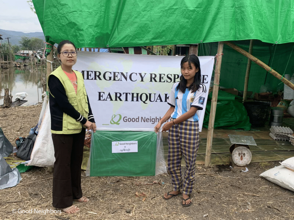Good Neighbors conducted an immediate emergency response in Myanmar and Thailand, including rapid needs assessments by Good Neighbors Myanmar. Collaborating with other local organizations, GNMMR delivered food, hygiene & medical supplies, and mosquito nets, though a large number of residents remained in need of critical supplies, including shelter kits. Civilians in the area were already experiencing violence and worsening humanitarian conditions, and the recent calamity places already vulnerable individuals in further danger.
